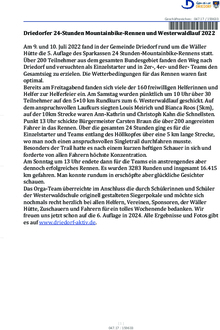 Am 9. und 10. Juli 2022 fand in der Gemeinde Driedorf rund um die Wäller Hütte die 5. Auflage des Sparkassen 24 Stunden-Mountainbike-Rennens statt.