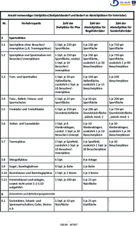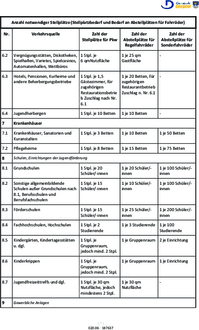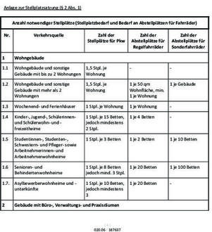 | (3) | Die Zahl der nach Abs. 1 herzustellenden Abstellplätze bemisst sich nach der dieser Satzung beigefügten Anlage, die verbindlicher Bestandteil dieser Satzung ist. Bei der Abstellplatzberechnung ist jeweils ab einem Wert der ersten Dezimalstelle ab fünf auf einen vollen Abstellplatz aufzurunden. |