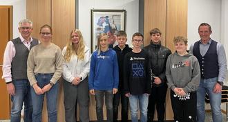 von links nach rechts: Markus Topitsch (Vors. der Gemeindevertretung), Josephine Schlösser, Leonie Haas, Lasse Ramdohr, Leon Noel Merkelbach, Till Müller, Benjamin Lehn, Meo Friedrich, Bürgermeister Carsten Braun
