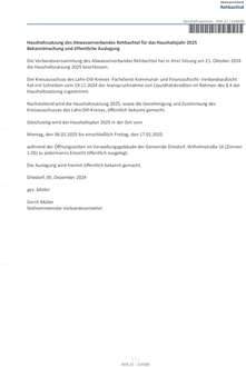 Gleichzeitig wird der Haushaltsplan 2025 in der Zeit vom Montag, den 06.01.2025 bis einschließlich Freitag, den 17.01.2025 während der Öffnungszeiten im Verwaltungsgebäude der Gemeinde Driedorf, Wilhelmstraße 16 (Zimmer 1.05) zu jedermanns Einsicht öffentlich ausgelegt.