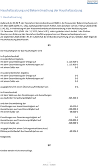 Aufgrund der §§ 92 ff. der Hessischen Gemeindeordnung (HGO) in der Fassung der Bekanntmachung vom 07. März 2005 (GVBl. I S. 142), zuletzt geändert durch Artikel 2 des Gesetzes vom 16. Februar 2023 (GVBl. S. 90, 93), in Verbindung mit der Wasserverbandshaushaltsverordnung in der Neufassung vom 19. Dezember 2019 (GVBl. I Nr. 3 / 2020, Seite 14 ff.), zuletzt geändert durch Artikel 1 des Fünften Gesetzes zur Änderung des Hessischen Ausführungsgesetzes zum Wasserverbandsgesetz vom 23. September 2024 (GVBl. I Nr. 54 / 2024) hat die Verbandsversammlung am 21. Oktober 2024 folgende Haushaltssatzung beschlossen: