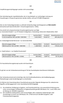 | 1.) | Als erheblicher Fehlbetrag im Ergebnis- und Finanzhaushalt bzw. eine wesentliche Erhöhung eines schon veranschlagten Fehlbedarfes im Ergebnishaushalt gemäß § 98 Absatz 2 Nr. 1 und 2 HGO, wird ein Betrag von 150.000 € angesehen. |