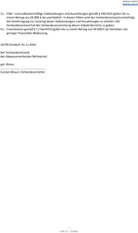| 3.) | Über- und außerplanmäßige Aufwendungen und Auszahlungen gemäß § 100 HGO gelten bis zu einem Betrag von 50.000 € als unerheblich. In diesen Fällen wird der Verbandsvorstand ermächtigt, die Genehmigung zur Leistung dieser Aufwendungen und Auszahlungen zu erteilen. Der Verbandsvorstand hat der Verbandsversammlung davon alsbald Kenntnis zu geben. |