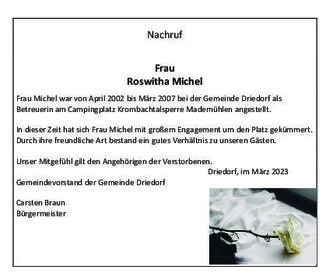 Frau Michel war von April 2002 bis März 2007 bei der Gemeinde Driedorf als Betreuerin am Campingplatz Krombachtalsperre Mademühlen angestellt.In dieser Zeit hat sich Frau Michel mit großem Engagement um den Platz gekümmert. Durch ihre freundliche Art bestand ein gutes Verhältnis zu unseren Gästen.