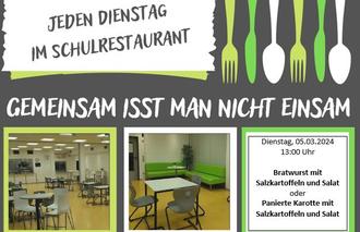 | Dienstag, 05.03.2024 13:00 Uhr Bratwurst mit Salzkartoffeln und Salat oder Panierte Karotte mit Salzkartoffeln und Salat |