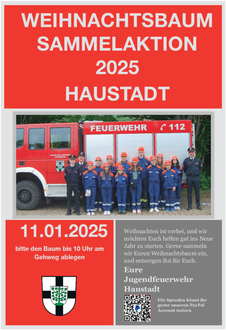 Am Samstag, den 11.01.2025 um 9:30 Uhr unterstützen wir unsere Jugendfeuerwehr bei der diesjährigen Weihnachtsbaumsammelaktion. Um Erscheinen wird gebeten.