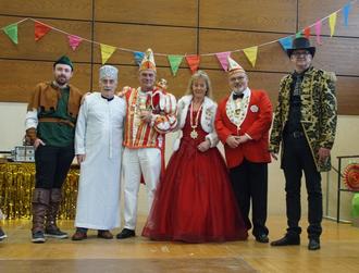 Auf der Narrenbühne fanden sich neben Bürgermeister Thomas Collmann auch Karnevalspräsident Michael Hecker, Prinzessin Tina I. und Prinz Andreas I., Ortsvorsteher Elmar Seiwert und der 2. Beigeordnete Marvin Bimperling (von rechts) ein