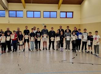 Die siegreichen Völkerball-Mannschaften mit ihren Betreuern sowie dem stellvertretenden Wehrführer Robert Gottfrydziak (links), Ortsvorsteher Thomas Ackermann (rechts neben ihm) und dem Gemeindejugendfeuerwehrbetreuer Timo Schumacher (Mitte mit weißem Hemd).