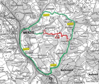 Die Umleitung erfolgt von Honzrath über die L 156 nach Beckingen und die L 174 nach Merzig. Umgekehrt von Merzig über die L 370 nach Hargarten und die L 156 nach Erbringen.