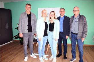 Bürgermeister Thomas Collmann und der Ortsvorsteher des Gemeindebezirkes Düppenweiler, Thomas Ackermann, gratulierten den beiden Ergotherapeutinnen Stephanie Federspiel (3.v.r.) und Anika Hübschen (2.v.l.) zur Neueröffnung ihrer Praxis „Ergotherapie Bewegungswelten“. Sie überreichten ein Präsent und wünschen viel Erfolg. Mit auf dem Foto ist der stellvertretende Ortsvorsteher von Düppenweiler, Jürgen Bohr.