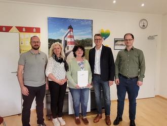 Für ihre 25jährige Tätigkeit als Gemeindebeschäftigte wurde Margarete Dykier geehrt. Frau Dykier wurde am 06.04.1999 als Aushilfsreinigerin bei der Gemeinde Beckingen eingestellt. Am 01.10.1999 erhielt sei einem unbefristeten Arbeitsvertrag und wurde in der Grundschule im Gemeindebezirk Düppenweiler eingesetzt. Diese Tätigkeit übt sie bis heute aus. Bürgermeister Thomas Collmann gratulierte Frau Dykier ganz herzlich zum 25jährigen Dienstjubiläum und lobte ihre hervorragende und zuverlässige Arbeit. Er dankte ihr für die geleisteten treuen Dienste für die Allgemeinheit und überreichte die Urkunde als Dank und Anerkennung sowie ein kleines Präsent. Zum 25jährigen Dienstjubiläum gratulieren außerdem der Fachbereichsleiter Personalwesen Marco Buchheit, die Fachvorgesetzte der Reinigungskräfte (Gebäudemanagement) Katja Schneider sowie der stellvertretende Personalratsvorsitzende Florian Schwarz.