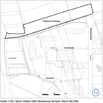 Die genauen Grenzen des Geltungsbereiches des Bebauungsplanes sind dem beigefügten Lageplan zu entnehmen. Er umfasst eine Fläche von insgesamt ca. 3,2 ha, wobei hiervon ca. 1,5 der Gemeinde Beckingen sowie ca. 1,7 ha der Stadt Dillingen/ Saar zuzuordnen sind.
