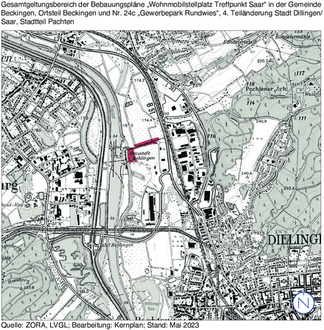 Der für eine touristisch-gewerbliche Entwicklung zu überplanende Bereich befindet sich anteilig auf den Gemarkungen Pachten (Stadt Dillingen/ Saar) und Beckingen (Gemeinde Beckingen). Während im Bereich des Dillinger Stadtteils Pachten die Entwicklung gewerblich-touristischer Nutzungen (z.B. Biergarten, Minigolf) geplant ist, sollen auf Beckinger Gemarkung Wohnmobilstellplätze entstehen und im östlichen Bereich (Höhe Kreisel) Flächen zur ökologischen Kompensation des Eingriffs der Gesamtmaßnahme in den Naturhaushalt bereitgehalten werden.