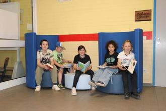 Einige Grundschulkinder probieren das neue Mobilar im Obergeschoss im Beisein von Bürgermeister Thomas Collmann, Schulleiterin Gertrud Lenhof und dem 1. Vorsitzenden des Fördervereins der Grundschule, Max Kammer, direkt aus.