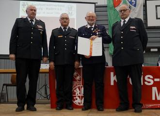 Im Rahmen der Delegiertenversammlung des Kreisfeuerwehrverbandes (KFV9 in der Weiskircher Hochwaldhalle erhielt der Brandmeister Josef Dillschneider aus Beckingen die silberne Ehrennadel des Deutschen Feuerwehrverbandes. Diese samt Urkunde wurde ihm durch die beiden Vizepräsidenten des Landesfeuerwehrverbandes Claus Kürsteiner und Gerhard Sauer sowie den Kreisfeuerwehrverbandsvorsitzenden Georg Flesch überreicht. Der Geehrte trat im Jahre 1970 in die Jugendfeuerwehr seines damaligen Heimatortes Brotdorf ein, ehe er nach seiner Heirat im Jahre 1979 als aktiver Wehrmann in den Löschbezirk Beckingen wechselte. Dort übte er verschiedene wichtige Funktionen wie Jugendfeuerwehrwart, Zugführer und Ausbilder, Atemschutzgerätewart und auch von 1991 bis 1996 das Amt des stellvertretenden Löschbezirksführers aus, ehe er 2014 aus gesundheitlichen Gründen aus dem aktiven Dienst in die Alterswehr wechseln musste. Seit 2010 vertritt Dillschneider als Beisitzer die Freiwillige Feuerwehr Beckingen im KFV und ist zudem auch Landesdelegierter. Er hat sich stets in vorbildlicher Weise für die Belange des LB Beckingen und des KFV Merzig-Wadern eingesetzt.