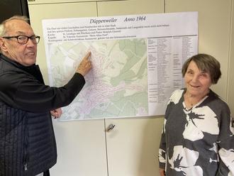 Karl-Rudi Wilhelm (links), Leiter des Archiv-Teams des Vereins Historisches Kupferbergwerk Düppenweiler - Verein für Geschichte und Kultur, freute sich über die von seiner Team-Kollegin Anni Weber gefertigte Karte zum Dorfleben im Jahre 1964.