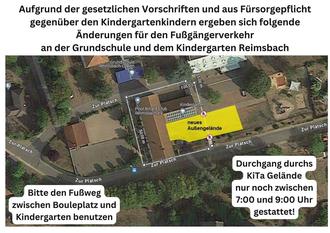 Aus diesem Grund ist der Durchgang durch das Gelände nur noch morgens zum Schulbeginn, während der Bringzeiten des Kindergartens von 7:00 Uhr bis 9:00 Uhr möglich.