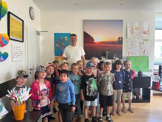 Gruppenbild der Vorschulkinder der KiTa St. Luzia Erbringen mit Bürgermeister Thomas Collmann in dessen Arbeitszimmer.