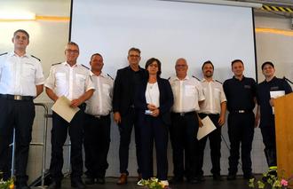 Die beförderten Wehrleute mit der Landrätin Daniela Schlegel-Friedrich (Mitte), Bürgermeister Thomas Collmann (4.v.l ), Löschbezirksführer Markus Diwersy (4.v.r.) und dem stellvertretenden Löschbezirksführer Michael Söther (3.v.l. )