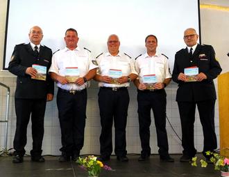 Auch den überörtlichen Repräsentanten der Feuerwehr LFV-Vizepräsident Gerhard Sauer (rechts), dem stellvertretenden KFV-Vorsitzenden Gerhard Klein (2.v.r.) wurde durch den Löschbezirksführer Markus Diwersy (Mitte) und seinem Stellvertreter Michael Söther (2.v.l.) mit einer Schallplatte des Haustadter Liedes als Erinnerungspräsent für ihr Kommen gedankt.