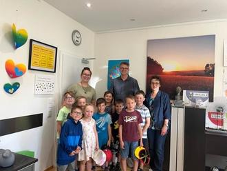 Spannend war es auch auf dem Einwohnermeldeamt. Die Kinder waren überrascht, was die Gemeindeangestellten auf dem Einwohnermeldeamt alles über sie wussten. „Hier bekommt ihr euren Kinderausweis, wenn ihr mit euren Eltern in Urlaub fahrt“ wurde ihnen erklärt. Nächste Station war das Trauzimmer. Eine ernste, aber auch schöne Angelegenheit, wie die Kinder erfuhren. Dass die Standesbeamten auch extra zur Schule müssen, wenn sie Trauungen durchführen möchten, hätten die Kinder nicht gedacht. Sie erfuhren, wie eine Trauung so abläuft und spielten eine Trauung durch. Danach war es Zeit für eine Pause im Sitzungssaal mit Capri-Sonne und Einback. Hier bekamen die Kinder auch ihr Geschenk, eine Trinkflasche mit dem Motiv des „SaarGartens“, überreicht. Dazu gab es auch einige Infos über den Sitzungssaal, der unter anderem so heißt, weil der Gemeinderat hier seine Sitzungen abhält. Dass dieser unter anderem von ihren Eltern gewählt wird und diese so mitbestimmen, was hier in unserer Gemeinde passiert, fanden die Kindern spannend.