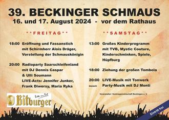 Die Beckinger Vereinsgemeinschaft rund um den Vorsitzenden des Beckinger Vereinskomitees, Frederic Zenner, präsentiert am Freitag, 16. und Samstag, 17. August 2024 die inzwischen 39. Auflage des Beckinger Schmaus vor dem Beckinger Rathaus. Das zweitägige Volksfest bietet auch diesmal ein abwechslungsreiches Programm für große und kleine Schmausgäste.