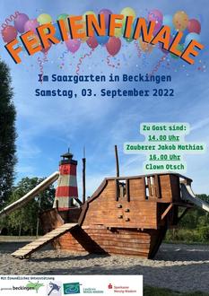 Die Sommerferien sind fast vorbei und die Schultasche steht schon gepackt in der Ecke. Ein letztes Mal wird aber noch die freie Zeit genossen und mit den Freunden auf dem Ferienfinale, am 03. September, in Beckingen gefeiert. Für die beste Unterhaltung der kleinen und großen Besucher sorgen der Zauberer Jakob Mathias und Clown Otsch.