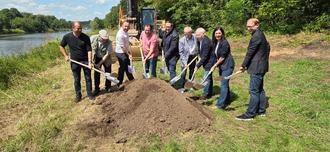 Feierlicher Spatenstich für den Lückenschluss des Saarradwegs: von links nach rechts: Andreas Groß (Beigeordneter der Gemeinde Rehlingen-Siersburg), Detlef Bley (Ortsvorsteher von Saarfels), Marvin Bimperling (2. Beigeordneter der Gemeinde Beckingen), Nicolas Adam (Fraktionsvorsitzender der CDU-Gemeinderatsfraktion), Sebastian Schmitt (Landtagsabgeordneter), Hubert Schwinn (Erster Beigeordneter der Gemeinde Beckingen), Jürgen Barke (Minister für Wirtschaft, Innovation, Digitales und Energie), Daniela Holzner (Kreisbeigeordnete des Landkreises Merzig Wadern und Landtagsabgeordnete) und Maximilian Doll (Erster ehrenamtlicher Beigeordneter der Stadt Merzig) setzen gemeinsam das erste symbolische Zeichen für den Beginn der Bauarbeiten.