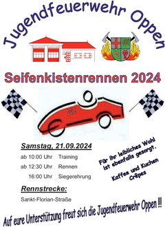 In diesem Jahr richtet unsere Jugendfeuerwehr das diesjährige Seifenkistenrennen aus. Hierzu sind alle Aktiven recht herzlich eingeladen, am Samstag, den 21.09.2024 ab 10:00 Uhr zu unterstützen.