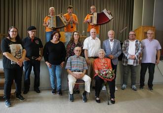 Anlässlich des Saarfelser Seniorentags, über den der Ortsvorsteher unter seiner Rubrik detailliert berichtet, wurden auch die beiden ältesten Teilnehmer geehrt. Dies waren die 93jährige Barbara Werwie geb. Kaczmarek und der 89jährige Karl Jenemann. Das Foto zeigt die beiden Geehrten mit dem ersten Gemeindebeigeordneten Hubert Schwinn (3.v.r.) und Ortsvorsteher Detlef Bley (4.v.r.) mit Mitgliedern des Ortsrates sowie im Hintergrund die 3 Musikanten.