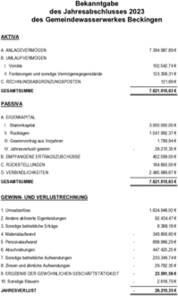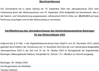 Bekanntgabe des Jahresabschlusses 2023 des Gemeindewasserwerkes Beckingen