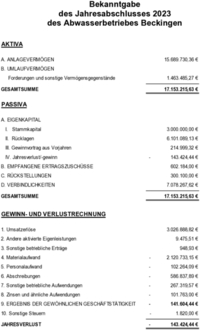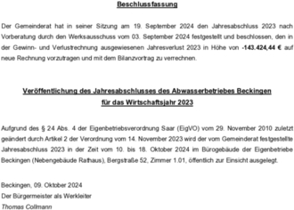 Bekanntgabe des Jahresabschlusses 2023 des Abwasserbetriebes Beckingen
