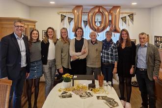Bürgermeister Thomas Collmann (links) und Ortsvorsteher Elmar Seiwert (rechts) gratulierten Josef Müller (unter der Zahl 0 stehend) im Kreise seiner Familie zur Vollendung des 101. Lebensjahres.