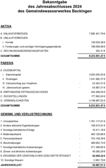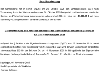 Bekanntgabe des Jahresabschlusses 2024 des Gemeindewasserwerkes Beckingen