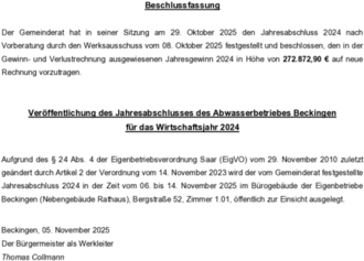 Bekanntgabe des Jahresabschlusses 2024 des Abwasserbetriebes Beckingen