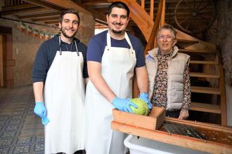 Die Jugendlichen Darvin Matura (2. v.l.) und Markus Müller (Mitte) die bewiesen am Kappesmesser ihr Talent Kohlköpfe zu Sauerkraut hobelten. Hiervon überzeugte sich auch die OGV-Vorsitzende Marga Grün (rechts).