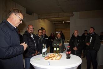 Bürgermeister Thomas Collmann bei seiner Ansprache zum Richtfest. Mit auf dem Foto ist neben anderen Gemeinderats- und Ortsratsmitgliedern auch Ortsvorsteher Elmar Seiwert (Mitte)