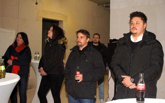 Die beiden Gemeindebeigeordneten Hubert Schwinn (2.v.r.) und Marvin Bimperling (rechts) sowie weitere Gemeinderatsmitglieder lauschen den Ausführungen von Bürgermeister Thomas Collmann (links)