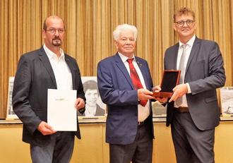 Bürgermeister Thomas Collmann (rechts) überreichte im Beisein von Ortsvorsteher Klaus Peter Scheuren (links) die Schatulle mit der Bürgerplakette an Paul Remmel