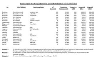 | 4.2 | Für die einmalige Überlassung von Gebäuden und Räumlichkeiten zur Durchführung von Veranstaltungen und Feierlichkeiten o.ä. erhebt die Gemeinde Beckingen folgende Gebühren: |