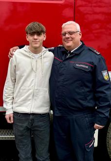 Löschbezirksführer Markus Diwersy mit seinem Sohn Maximilian, der in die aktive Wehr übernommen wurde