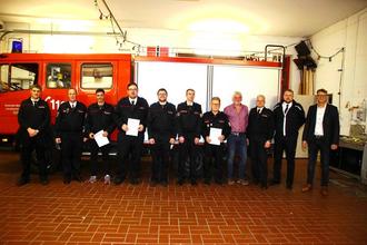 Die beförderten und geehrten Wehrmänner mit den Führungskräften und Gästen