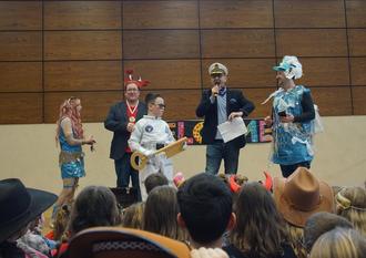 Auf der Bühne standen neben Bürgermeister Thomas Collmann (2.v.r.) und seiner Sekretärin Andrea Krüger (links), dem Kulturamtsleiter Thorsten Nicola und MdL Sebastian Schmitt (2.v.l.) auch der Schüler Simon mit dem Rathausschlüssel