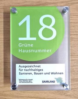 Seit Oktober 2023 wird die „Grüne Hausnummer“ erneut vom Ministerium für Umwelt, Klima, Mobilität, Agrar und Verbraucherschutz für Neubauten und Sanierungen vergeben. Mitmachen können Gebäudeeigentümerinnen und Gebäudeeigentümer, die bestimmte Nachhaltigkeitskriterien in den Bereichen Energieeffizienz, Energieverbrauch, Baustoffe und Ressourcen erfüllen.