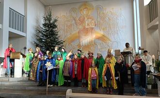 „Wie jedes Jahr, so stehen auch heute hier die Sternsinger von Wölfersheim - Echzell vor eurer Tür!“ So begannen die Sternsinger bei zahlreichen Besuchen von Tür zu Tür ihren Segensspruch. Anfang Januar waren 25 Kinder und 10 erwachsene Gruppenbegleiter und -begleiterinnen an sieben Lauftagen in Wölfersheim und Echzell unterwegs. Von einer ehrenamtlichen Helferin und einer Familie wurden sie mit Mittagessen verpflegt. Die Sternsinger sangen bei ihren Besuchen Lieder, brachten Gottes Segen für das neue Jahr zu den Menschen und sammelten Spenden für Kinder in aller Welt. An einige Haushalte im Gemeindegebiet wurden Segensbriefe verteilt. Das Motto der Sternsingeraktion 2026 war: „Schule statt Fabrik - Sternsingen gegen Kinderarbeit“. Mit dem gesammelten Geld werden im diesjährigen Beispielland Bangladesch und weltweit Hilfsprojekte für Kinder unterstützt. In der katholischen Gemeinde Wölfersheim - Echzell sammelten die Sternsinger in diesem Jahr die stolze Summe von 7898 Euro. Zum Abschluss der diesjährigen Aktion versammelten sich die Sternsinger in ihren bunten Gewändern am 11. Januar in der Kirche Christkönig in Wölfersheim zu einem Gottesdienst mit der Gemeinde. Dort wurden gemeinsam auch viele fröhliche Sternsingerlieder gesungen.
