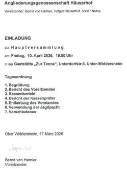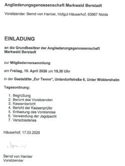 Einladung Mitgliederversammlung Grundbesitzer Markwald Berstadt und Angliederungsgenossenschaft Häuserhof