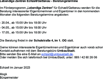 Im Förderprogramm „Lebendige Zentren“ für Echzell/Gettenau werden für die Beratung interessierter Eigentümerinnen und Eigentümer in den kommenden Monaten die folgenden Beratungstermine angeboten: