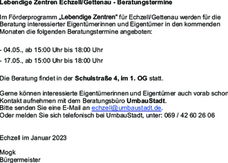 Im Förderprogramm „Lebendige Zentren“ für Echzell/Gettenau werden für die Beratung interessierter Eigentümerinnen und Eigentümer in den kommenden Monaten die folgenden Beratungstermine angeboten: