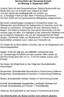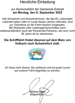 Alle Einwohner und Einwohnerinnen, die das 65. Lebensjahr vollendet haben oder im Laufe dieses Jahres vollenden, sind zur Teilnahme an der Fahrt herzlich eingeladen.