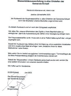 der Austausch der Hauptwasserzähler in allen Ortsteilen der Gemeinde Echzell durch die Mitarbeiter unseres Bauhofes vorgenommen wird.